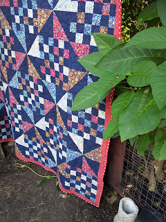 And here's a shot of the backing and binding. I added a strip of the squares from the front that were left over. Sandy had sewn these all into a long roll. I see more of them showing up in the future.